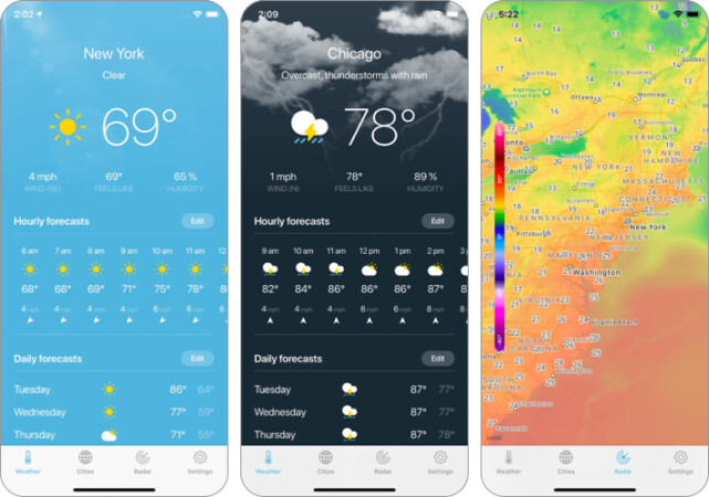 Clime, iPhone ve iPad hava uygulamaları arasında en iyi işlevlerden bazılarını sunar. Çevrenizdeki çeşitli yerler için gerçek zamanlı bir tahmin sağladığı için gezginler için en iyi hava durumu uygulamalarından biridir.