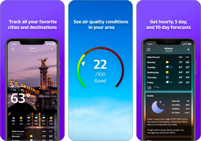 Yahoo Weather, ücretsiz bir uygulama için büyük bir değer sunar. Uygulama 24 saat içinde saatlik bir sıcaklık tahmini ve bir saat içinde 15 dakikalık aralıklı yağış tahmini verir. Bu nedenle, hava zamanları gerçek zamanlı olarak değiştikçe kullanıcılar döngüde kalırlar.