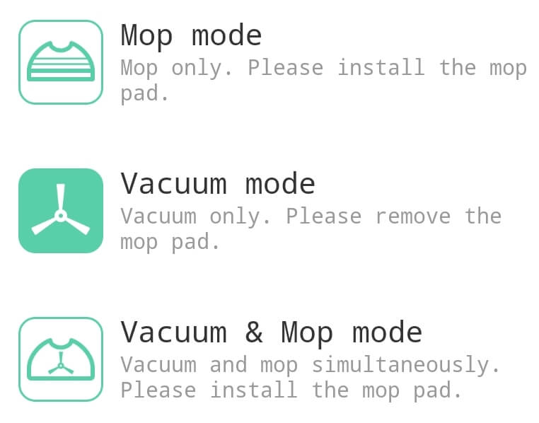 Robovac'ın şu arasında geçebileceğiniz üç temizlik modu vardır:paspas modu,bu paspas pedinin kurulumunu gerektirir,vakum modu,paspas ped olmadan gerçekleştirilebilir vevakum ve paspas modu,bu da robovac boşluğunu ve paspas'ı aynı anda yapar.