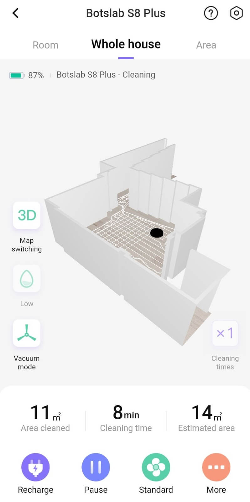 Görünüşe göre Botslab ses ve komutlarla farklı bir şey yapmaya çalıştı. Örneğin, Robovac'ı duraklattığınızda ve sonra yeniden başlattığınızda, S8 Plus, “Temizlik beni mutlu ediyor” diyor, sanırım sizi güldürmeli veya en azından gülümsemelidir. Ne yazık ki, tek yaptığı iyi bir günde sizi rahatsız etmek. Kötü bir günde, hacmi mutlak bir minimum seviyeye düşürmeyi seçiyorum.