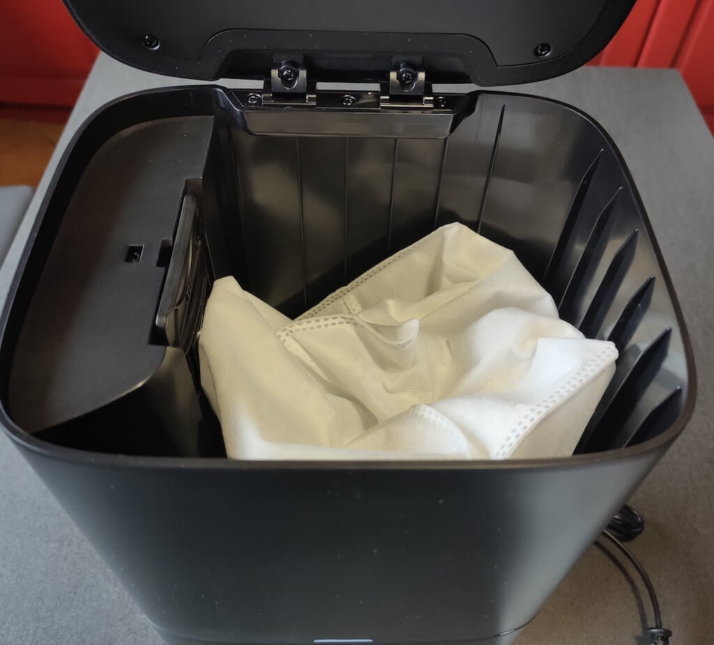 Üssü içinde beklediğimden daha iyi görünen önceden yüklenmiş bir toz torbası bulacaksınız. Karton yerine plastik bir sızdırmazlık vardır ve çok dayanıklı görünüyor. Pakete dahil olmak üzere iki ekstra toz toplama çantası bulacaksınız, bu nedenle ekstra toz torbaları satın almak zorunda kalmadan yılın iyi bir parçası için ayarlanmalısınız.