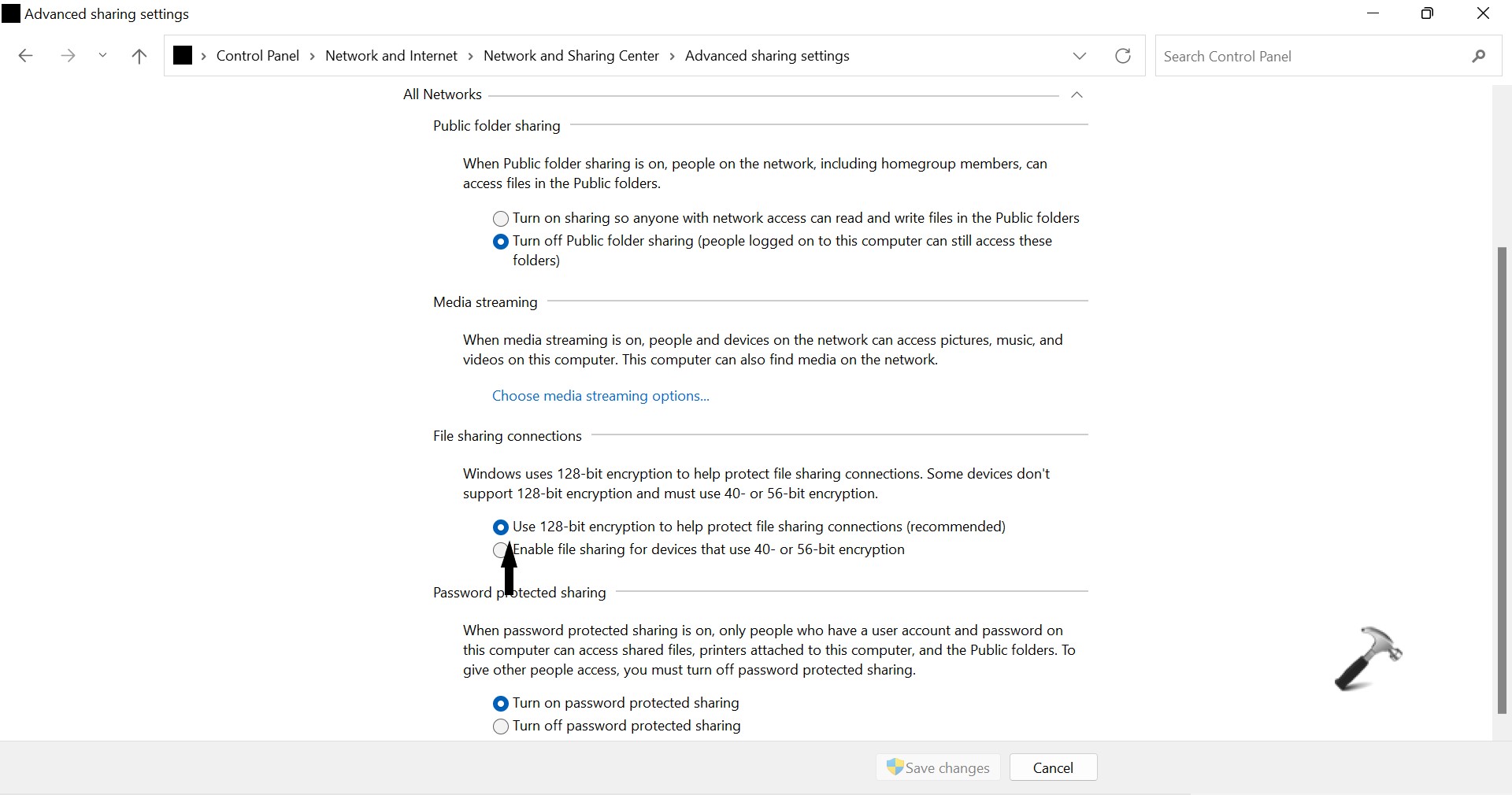 6. Seçin128 bit şifreleme (önerilir)veya40- veya 56 bit şifrelemeondanDosya Paylaşım BağlantılarıDop-Down menü.
