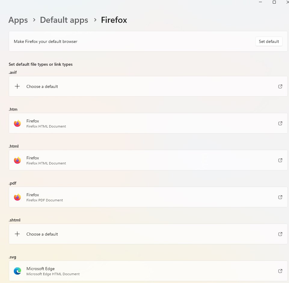 Konuya geri dönün, Windows 11'deki varsayılan tarayıcıyı değiştirmek biraz kafa karıştırıcı. Bir uygulamayı varsayılan olarak ayarlamanın, tüm web protokollerini işlemek için Go-to uygulaması haline getireceğini varsayarız, ancak o kadar basit değil, her tür için değiştirmeniz gerekiyor.
