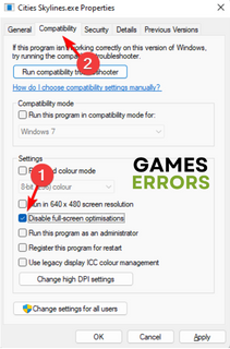- Özellikler iletişim kutusunda,UyumlulukSekme ve FullScreen Optimizasyonlarını Devre Dışı Bırak seçeneğini kontrol edin. BasmakUygulaVeTAMAM.