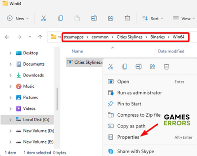 C:Program Files (x86)SteamsteamappscommonCities SkylinesBinariesWin64 - Ardından, sağ tıklayınŞehirler skylines.exeDosya ve özelliklere tıklayın.