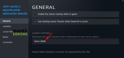 - Oyun Özellikleri penceresinde tıklayınGenelsoldaki. Şimdi, sağdaki lansman seçeneklerine gidin ve yazın-Force-d3d9.