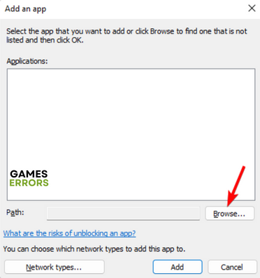 - Ardından, oyunun kurulum klasörüne gidin ve listeye eklemek için Ekle'ye basın.