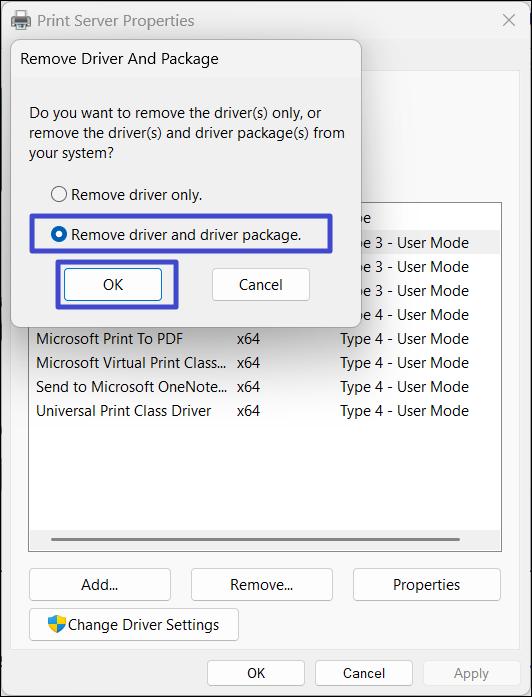 6. Görünen küçük açılır pencerede “Sürücü ve sürücü paketini kaldırın.”Ve tıklayın"TAMAM”Onaylamak için.