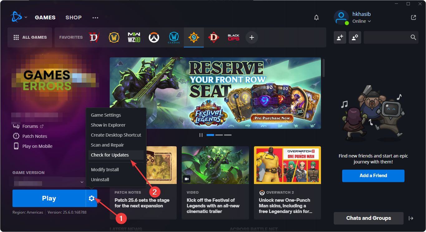 - İçindeBattle.net uygulaması, üzerine tıklayınvites simgesiDiablo 4 oyunu için ve seçinGüncellemeleri kontrol edin.