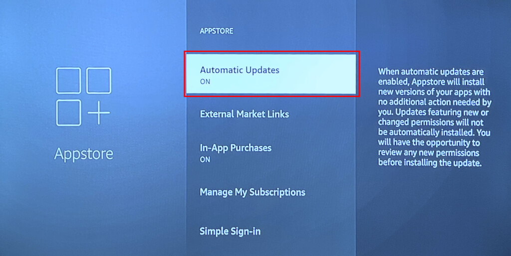 Fire TV'nizde “otomatik güncellemeleri” etkinleştirmenizi öneririz, böylece Disney+ ve herhangi bir modası geçmiş uygulamayı otomatik olarak günceller.
