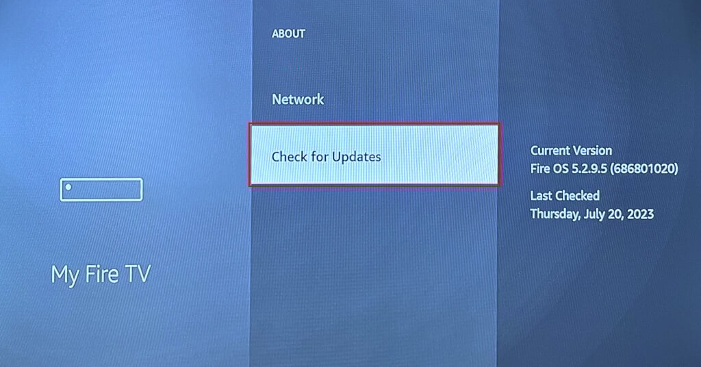 Eski veya Buggy yazılım sürümünü çalıştıran Fire TV cihazları, belirli uygulamaları çalıştıran sorunlarla karşılaşabilir. Amazon genellikle sistem hatalarını ve uygulama arızalarını çözen yangın işletim sistemi güncellemelerini yayınlar. Ateş TV Ayarları menünüze gidin ve Fire TV'niz için mevcut güncellemeleri yükleyin.