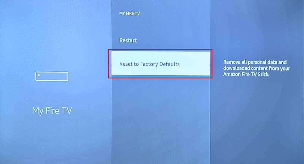 Gidip gelmekAyarlar>Fire TV'm>Fabrika varsayılanlarına sıfırlayınve seçSıfırlamakOnay ekranında.