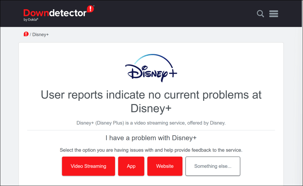 Akış uygulaması Fire TV'nizde çalışmıyorsa, Disney Plus sunucularıyla ilgili bir sorun var veDiğer Desteklenen Cihazlar. Kontrol etDownDetector'da Disney+ Durum SayfasıOlası sunucu kesinti veya kesinti için.