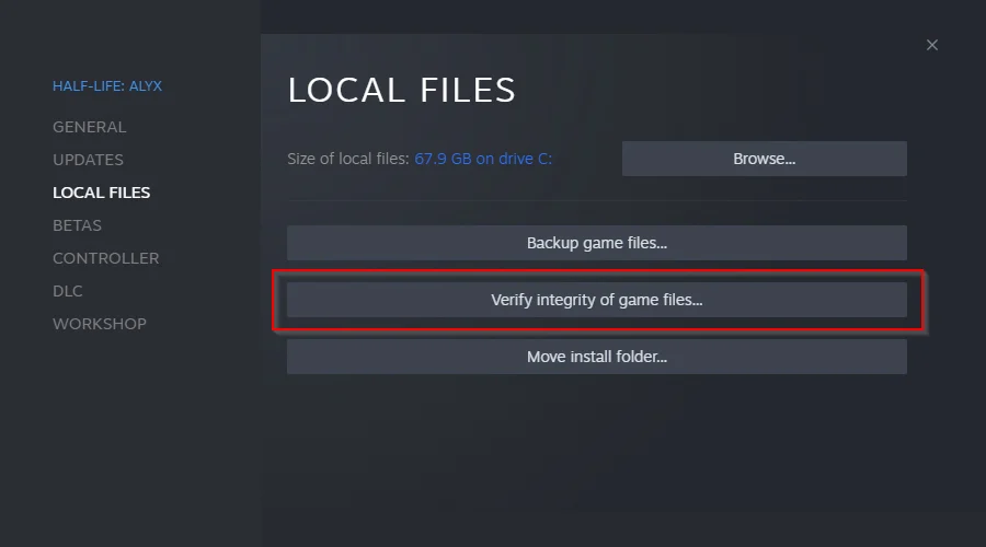 - Üzerine tıklayınYerel dosyalarSekme, ardından seçinOyun dosyalarının bütünlüğünü doğrulayın.