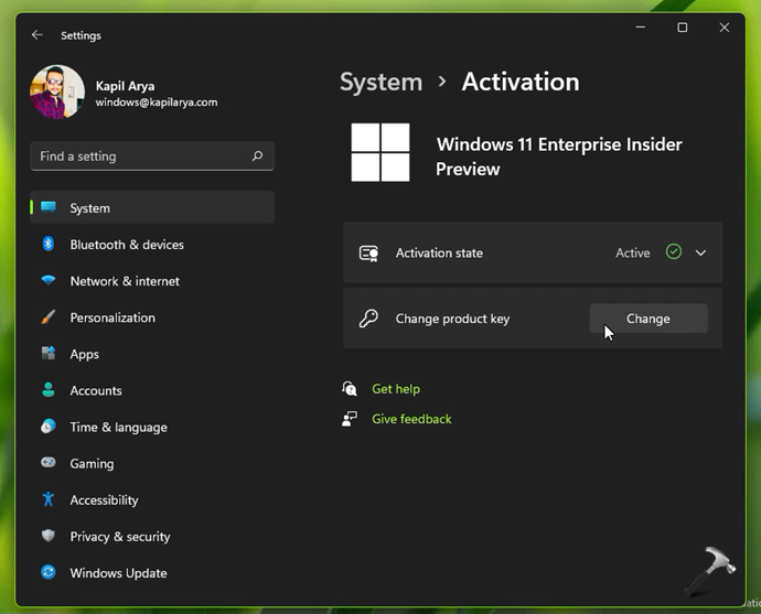 3.Etkinleştirme altında,DeğiştirmekÜrün anahtarını değiştirmenin yanındaki düğme.