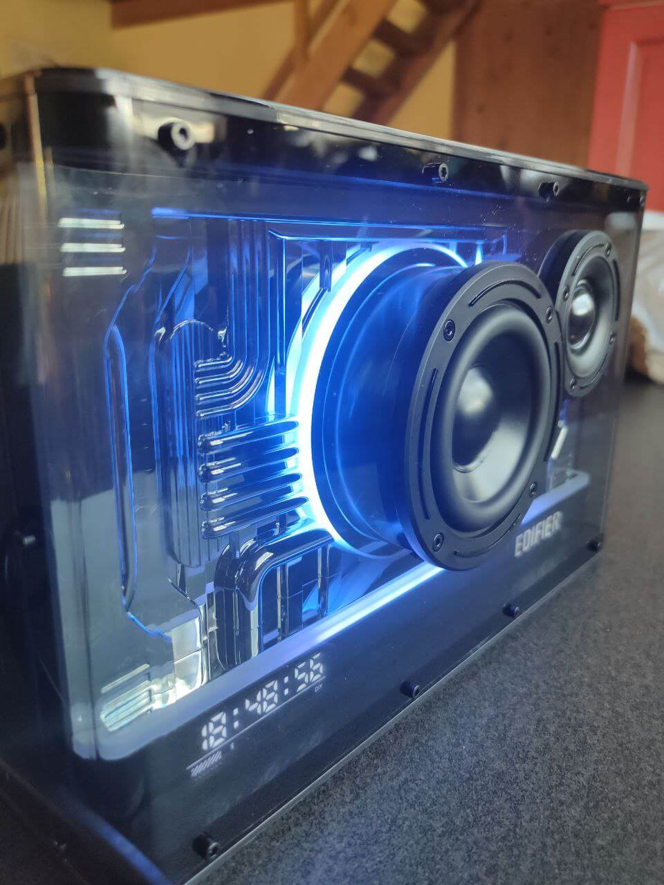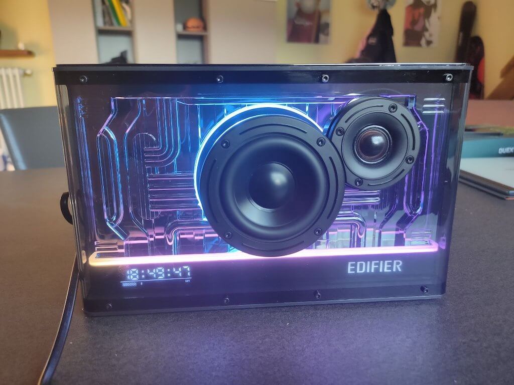 Ancak, bu masa üstü hoparlörün ana satış noktası, hemen çekileceğiniz inanılmaz ışık şovudur. Hoparlörün ışık ekranı bir düğme veya edifier connect uygulaması kullanılarak değiştirilebilir. Işık şovu, özellikle karanlıkta müzik dinlerken etkileyici görünüyor. QD35, bir yarı römorku andıran üst panele sahip endüstriyel bir tasarıma sahiptir ve üzerinde büyük bir editör logosu vardır. Siyah veya beyaz renkte mevcuttur ve bu incelemenin amaçları için siyah versiyonum vardı. Alt ön panelde yerleşik bir saat de var.