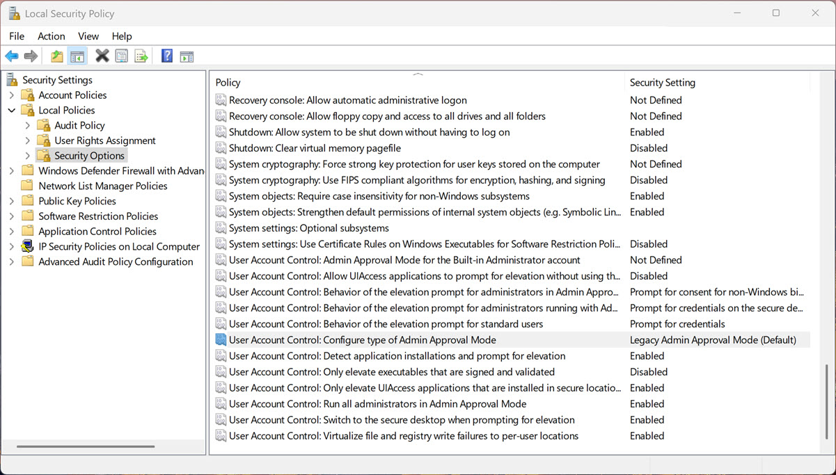 3. “Kullanıcı Hesabı Denetimi: Yönetici Onay Modu türünü yapılandırın” adlı ayarı bulun ve açın.