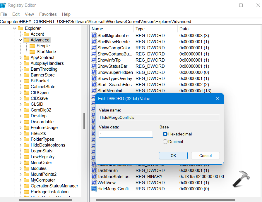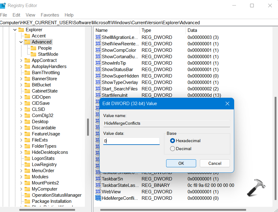 3.Bir kez orada, iki çift tıklayınHidemergeconflictsReg_dword ve değer verilerini değiştirin.0Windows 11'de klasör birleştirme çatışmalarını etkinleştirmek için.