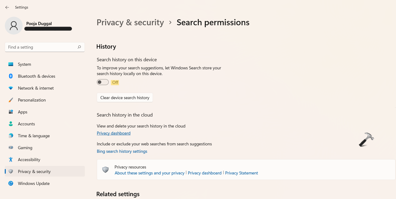 3.Yoksa, geçişi çevirinKapalıWindows 11'de arama geçmişini devre dışı bırakmak için.