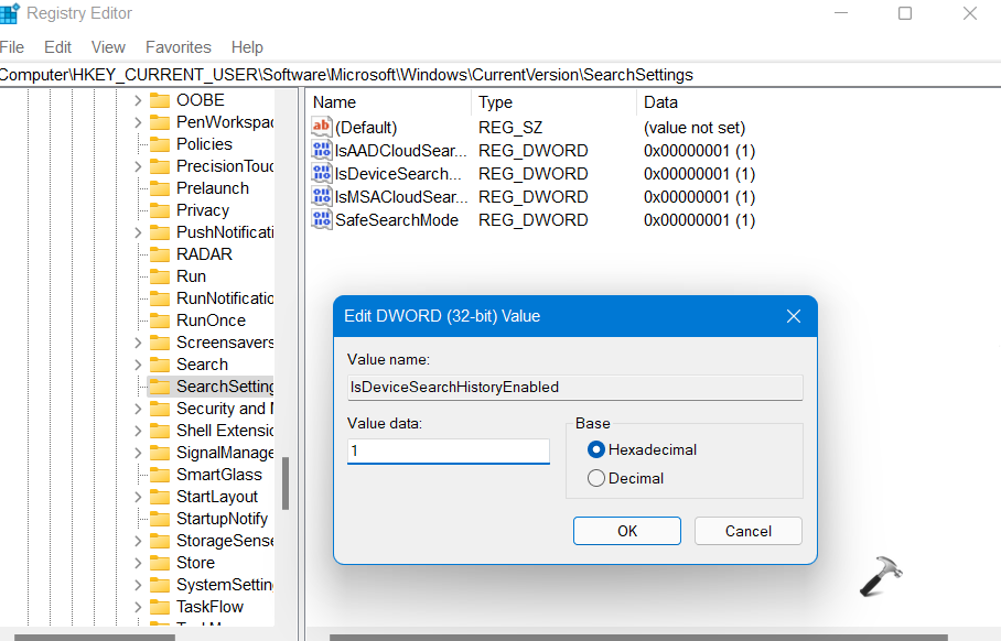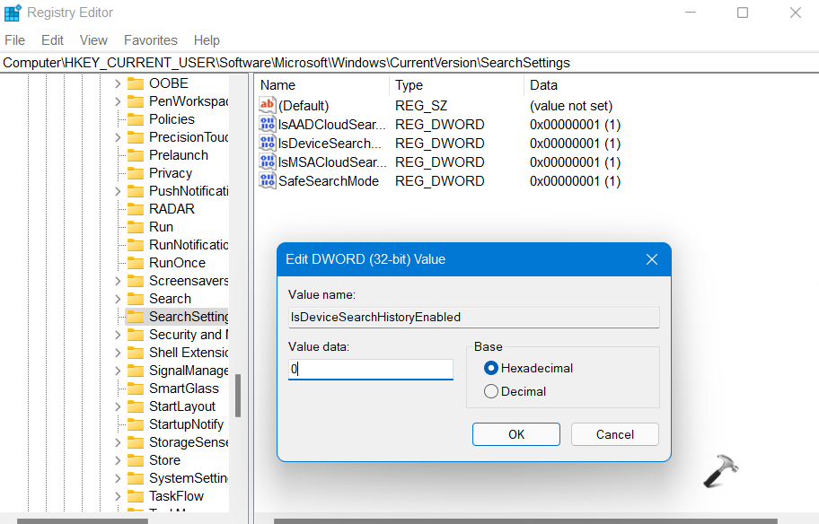 4.Yoksa, değer verilerini değiştirinIsDevicesearchhistoryenablableReg_dword0Windows 11'de arama geçmişini devre dışı bırakmak için.