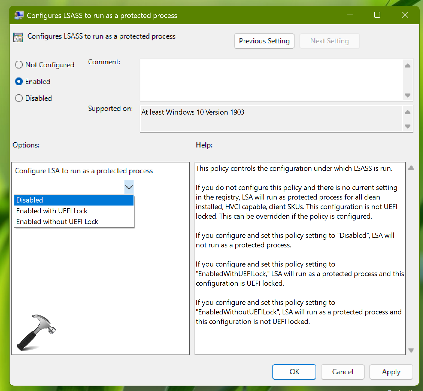 4. Şimdi politika durumunu ayarlayınEtkinleştirilmişVe seçenekler için,LSA'yı korumalı bir işlem seçeneği olarak çalıştıracak şekilde yapılandırın, istediğiniz seçeneği seçin. Uygula tıklayın, Tamam.