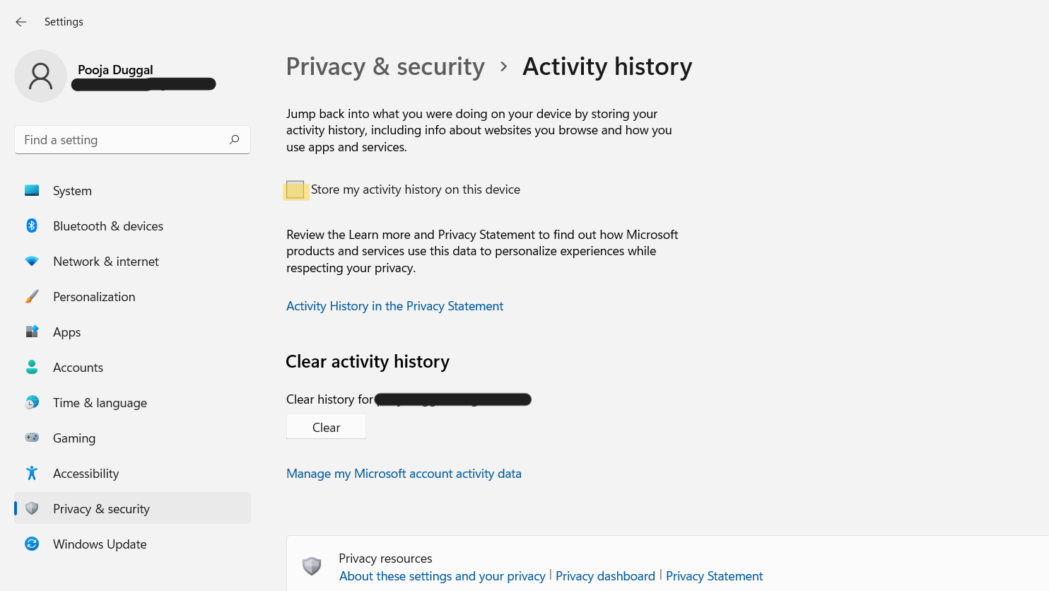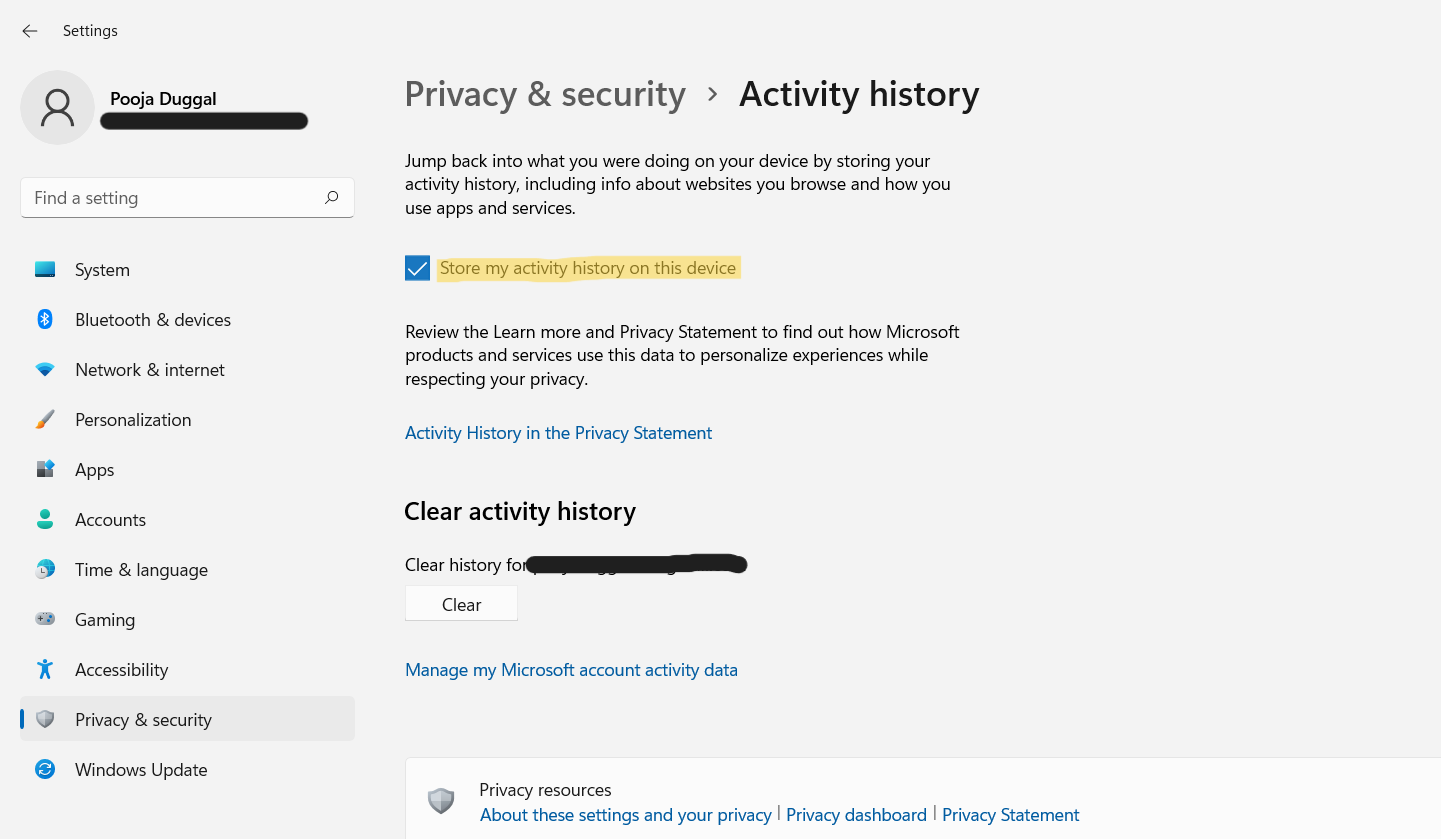 Daha fazla bilgi edin:Windows 11'de etkinlik geçmişini depolama geçmişi nasıl devre dışı bırakılır