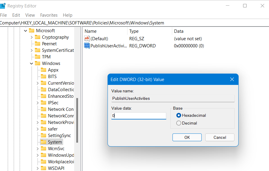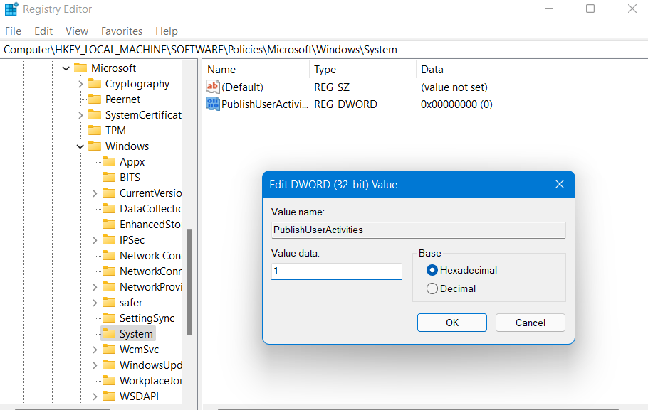Yoksa, çift tıklayınPublishuserActivitiesve değer verilerini Windows 11'deki etkinlik geçmişini devre dışı bırakacaktır.