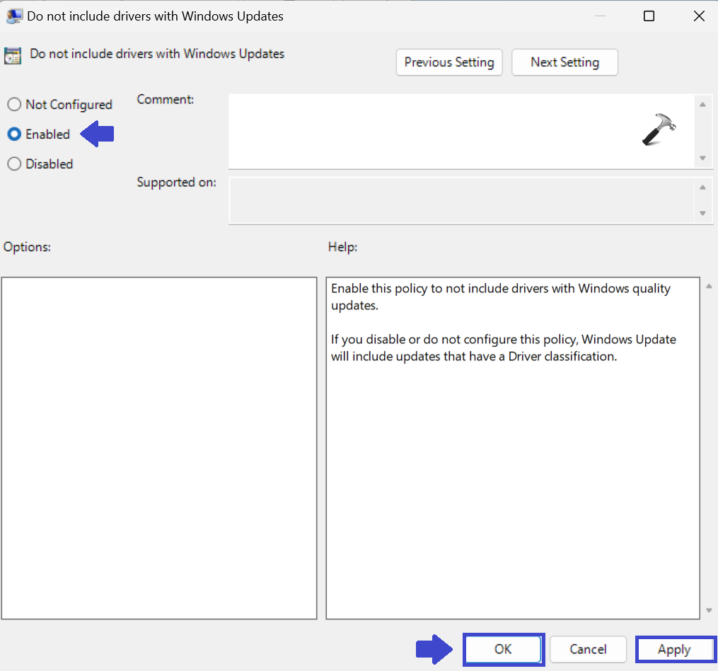 “Windows güncellemesine sahip sürücüyü eklemeyin” i etkinleştirmek için “Etkin” seçeneğini seçin.