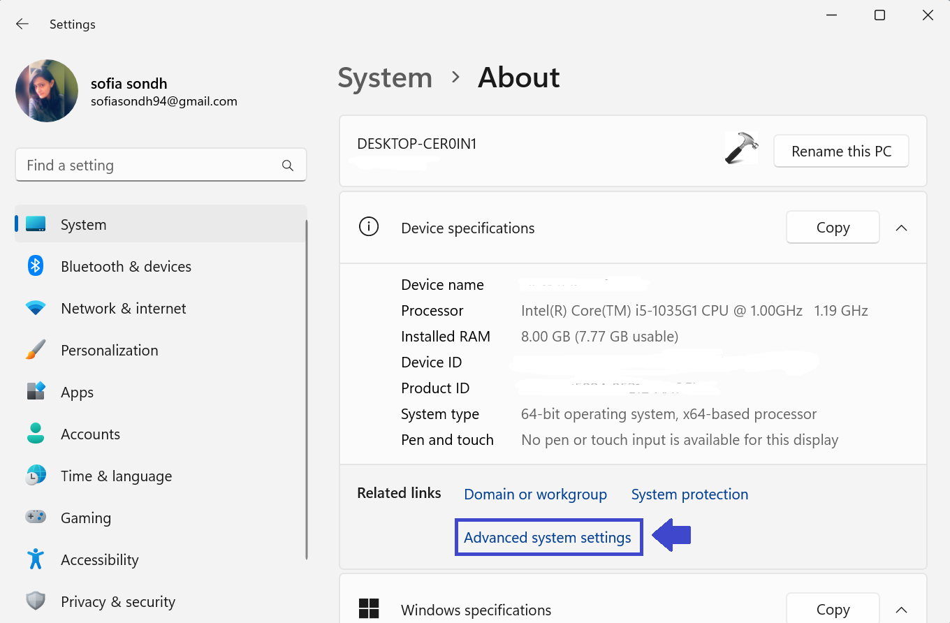 2. “Cihaz Özellikleri” altında “Gelişmiş Sistem Ayarları” nı tıklayın.