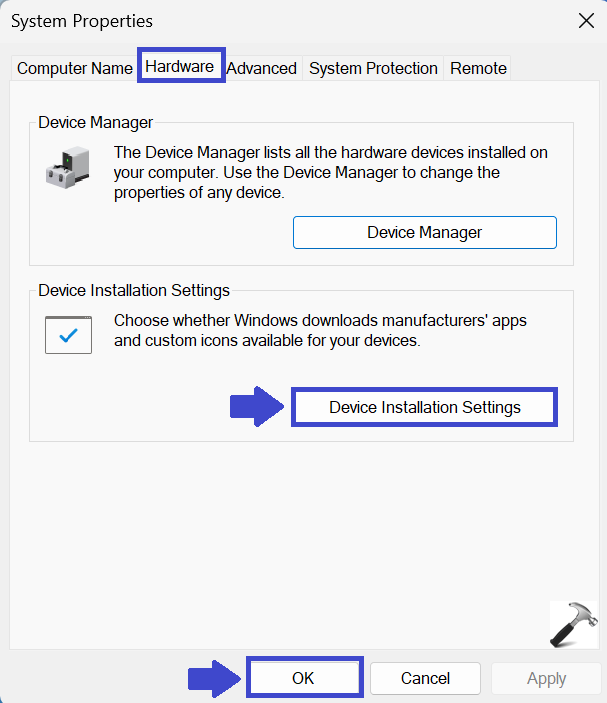 3. Donanım sekmesini seçin ve “Aygıt Kurulumu Ayarları” nı tıklayın.