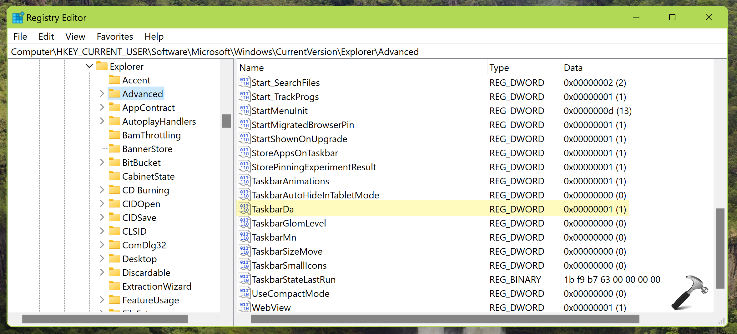 HKEY_CURRENT_USERSoftwareMicrosoftWindowsCurrentVersionExplorerAdvanced