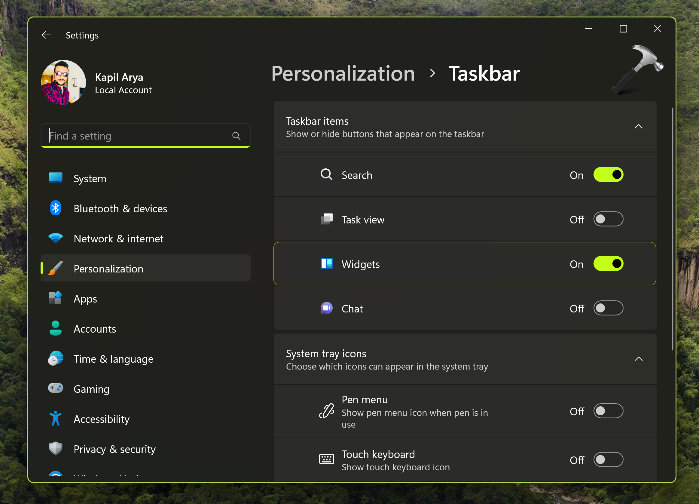 3.Widgets seçeneğini burada kapatabilirsiniz ve hemen devre dışı bırakılmalıdır. Daha sonra Ayarlar uygulamasını kapatabilir ve çalışmanıza geri dönebilirsiniz.