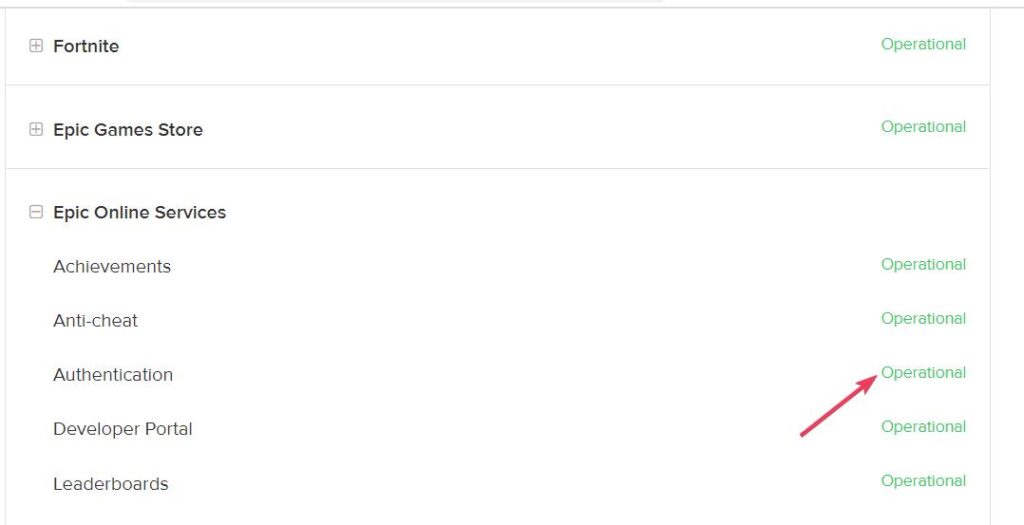 İlk olarak, dikkate değer bir epik oyun hizmeti sorun olup olmadığını kontrol edin. Bunu yapmak içinEpic Oyunlar Durum Sayfası. Ardından, çalışma durumlarını kontrol etmek için Epic Games Store ve Epic Online Hizmetleri gibi kategorilere çift tıklayın.