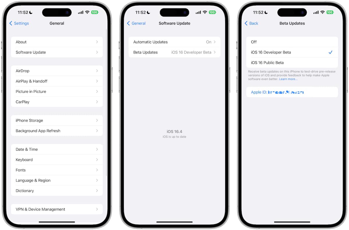 Yeni güncelleme iş akışı, geliştirici programına sahip kayıtlı üyelerin geliştirici beta veya genel beta güncellemelerine erişmek ve kişisel kullanım için iki farklı Apple kimliği kullanmalarına olanak tanır.