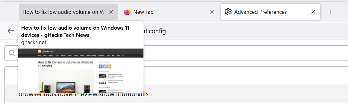 - Browser.tabs.hoverpreview.Enabled adresini arayın.