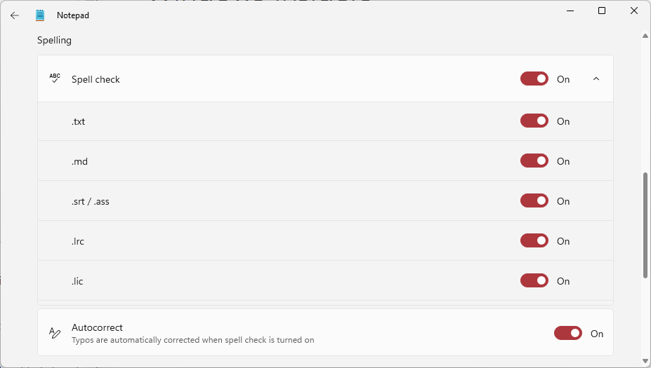 Yazım kontrol ayarları temeldir. TXT, MD, SRT, ASS, LRC ve LIC gibi belirli dosya türleri için işlevselliği değiştirebilirsiniz.