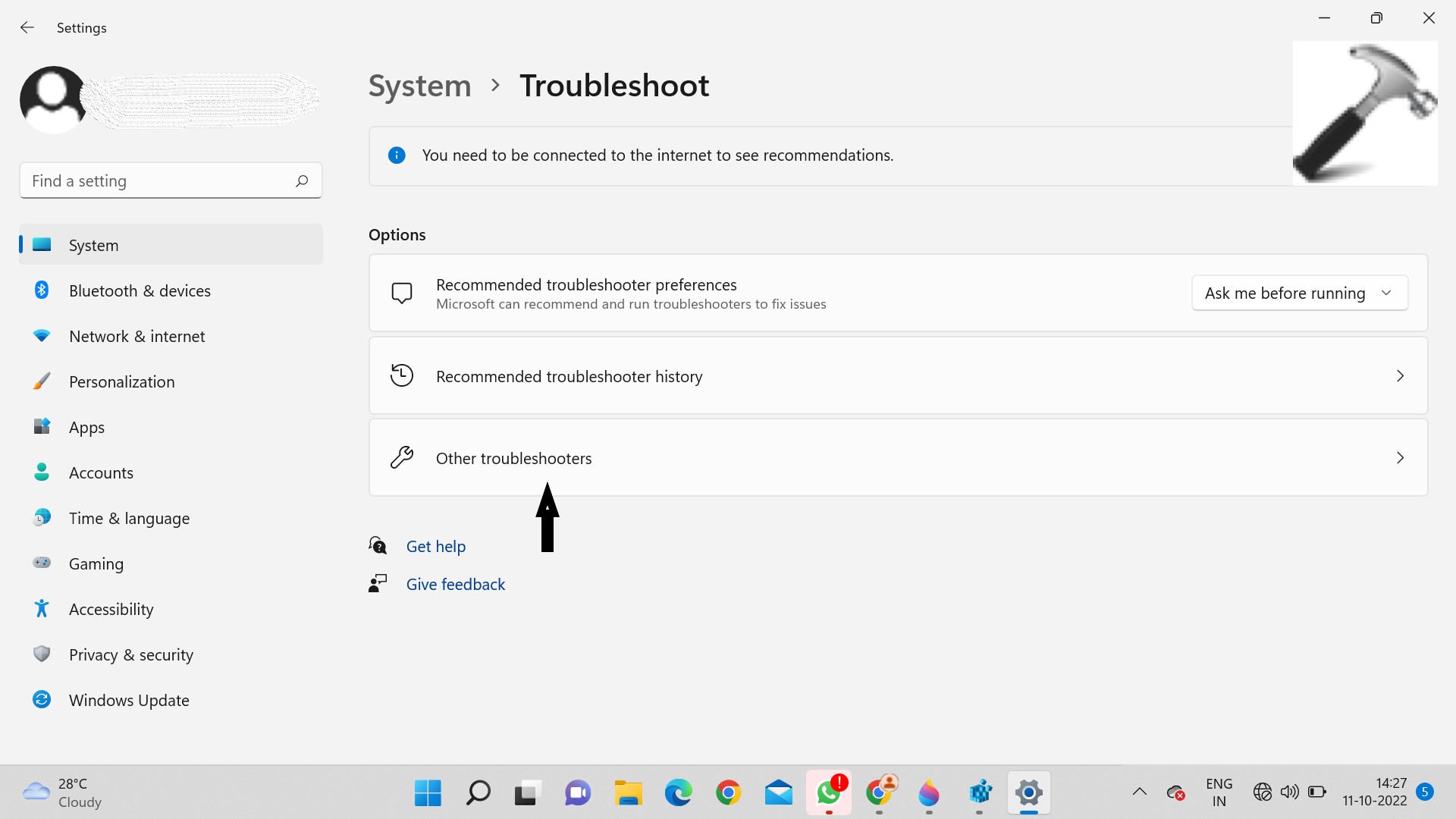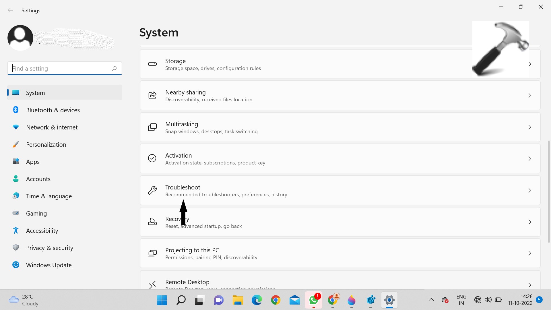 2. SeçinSistemsağ bölmeden, ardından seçmeSorun gidermeksoldan.