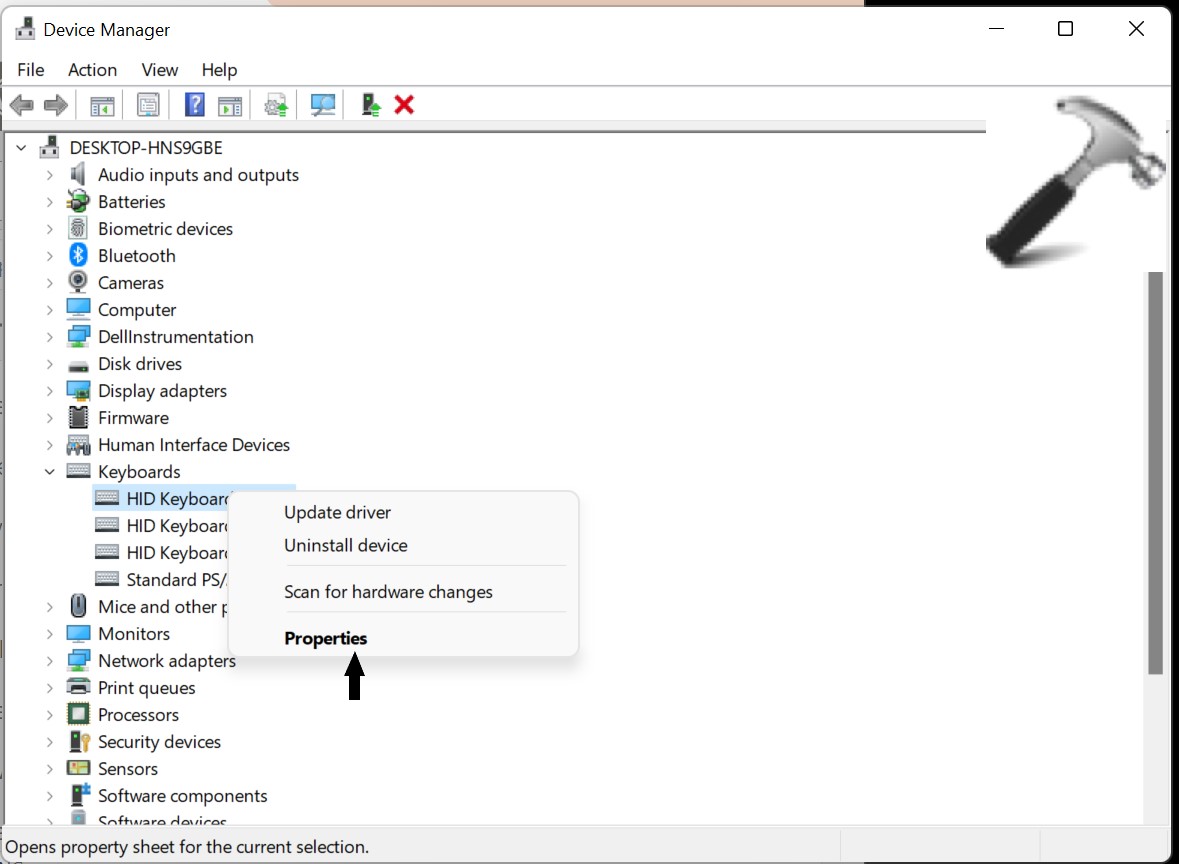 4. Cihaz sürücüsüne sağ tıklayın ve seçinÖzellikler.