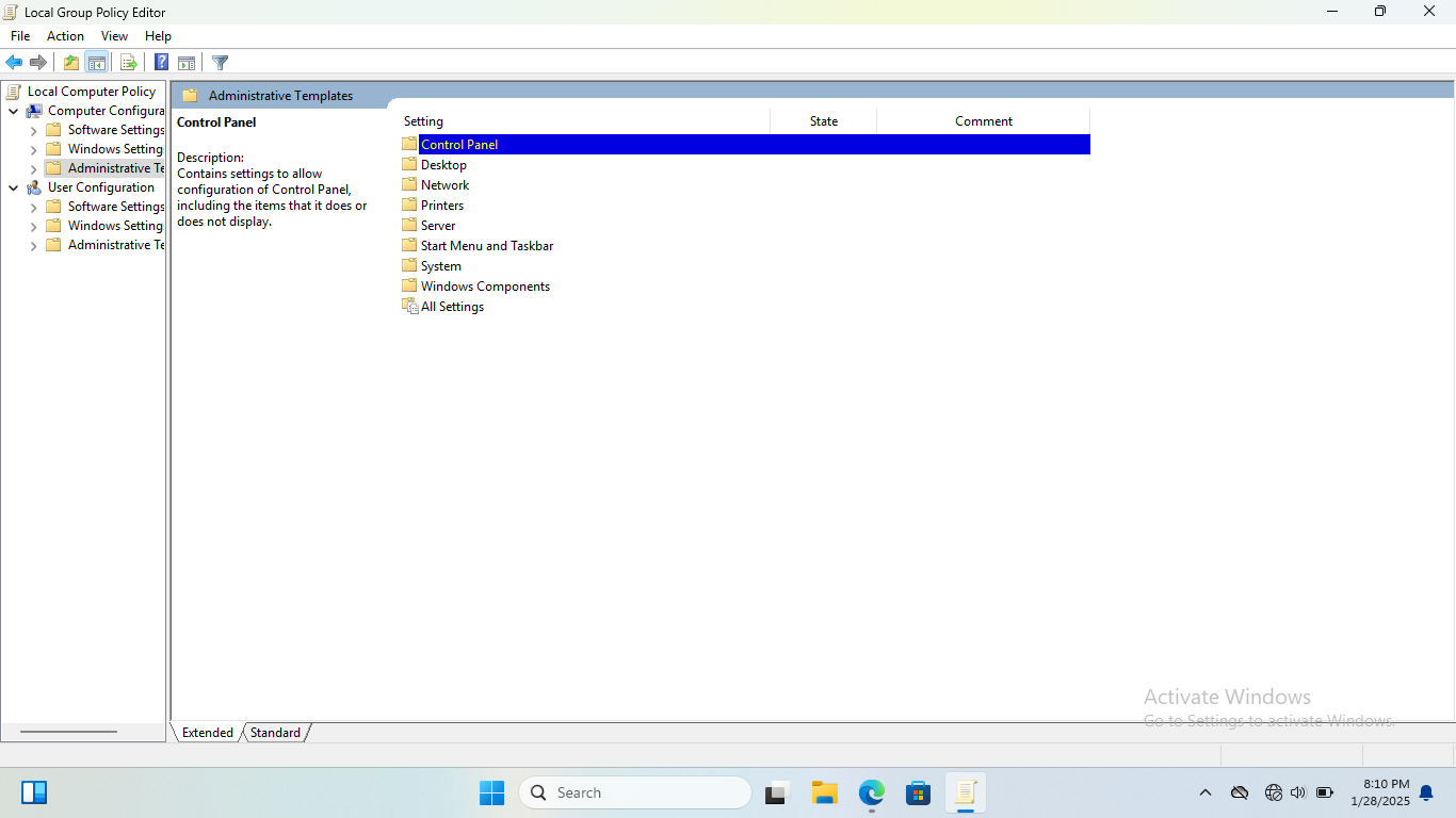 Adım 2-Ardından, bilgisayar yapılandırmasına gidin ve daha sonra yönetim şablonundaki kontrol paneline gidin.