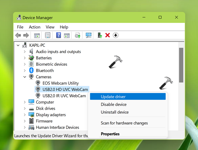 - Kameranızı bulamıyorsanız, Eylem menüsünü seçin, ardından Donanım Değişiklikleri için Tarama'yı seçin.