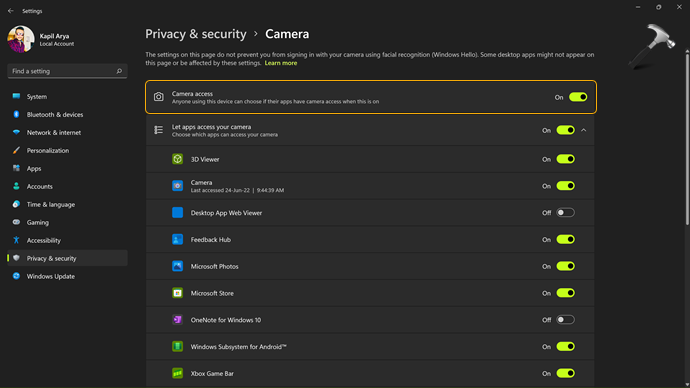 Yukarıda belirtilen önceki düzeltmeler sizin için çalışmıyorsa, Windows 11'deki kamera gizlilik ayarlarını kontrol edebilirsiniz. Bunlar OS seviyesi gizlilik ayarlarıdır ve etkin değilse, kamera sizin için çalışmaz. Gizlilik ayarları altında kamerayı kontrol edebilir ve etkinleştirebilirsiniz.Ayarlar Uygulama> Gizlilik ve Güvenlik> Kamera. DönüşAçıkKamera erişim seçeneği burada.