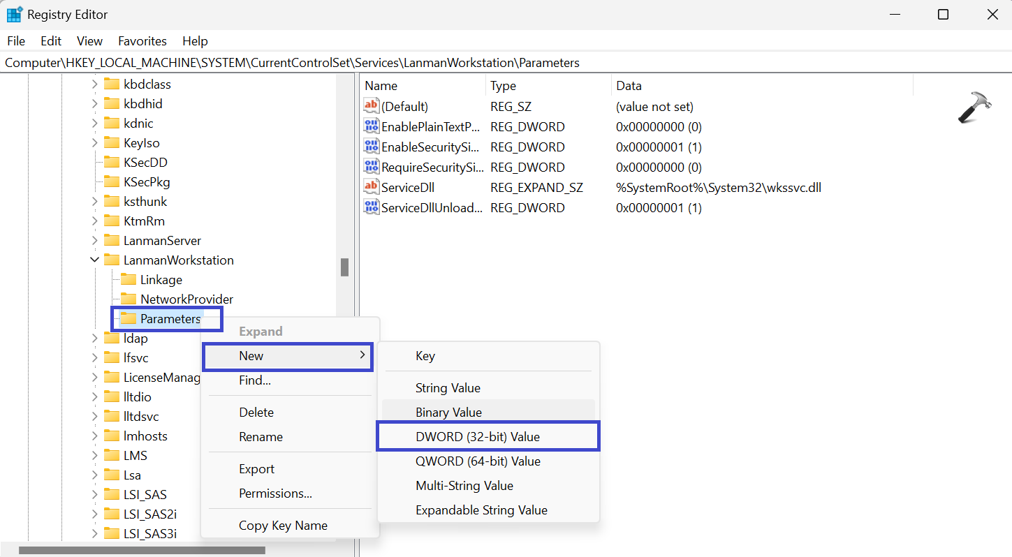 HKEY_LOCAL_MACHINESYSTEMCurrentControlSetServicesLanmanWorkstationParameters