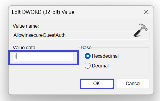 AyarlayarakAllowInsecureGuestAuthDeğer 1'e, konuk hesabını etkinleştirebilir ve Windows'un ağdaki diğer bilgisayarları görmesine izin verebilirsiniz.