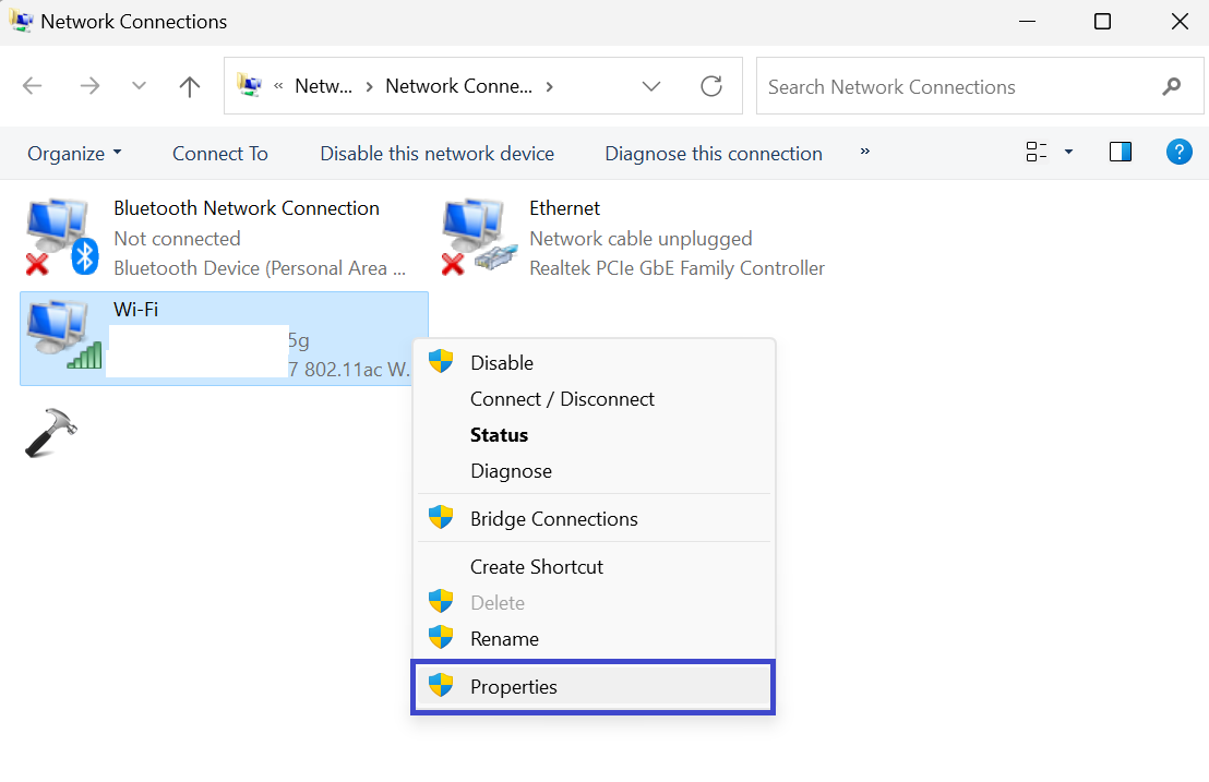 3. Ağınızı seçin ve üzerine sağ tıklayın. Seçme "Özellikler".