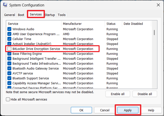 Çözüm 4: Sistem yapılandırmasını kullanarak Bitlocker'ı kapatın
