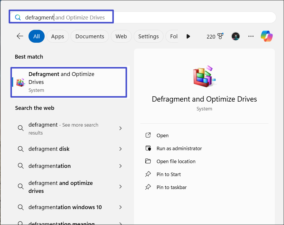 1. Başlat düğmesine tıklayın, “yazın”Bozulma"Arama çubuğunda ve"Bozulma ve sürücüleri optimize et”Sonuçlardan.