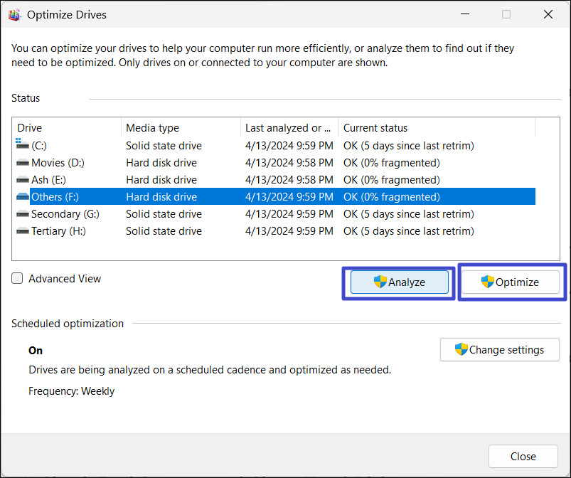 3. İlk olarak, tıklayın:Analiz etmek”Diski parçalama için analiz etmek için. Ardından,“Optimize etmek”Sürücüyü çözmek için.