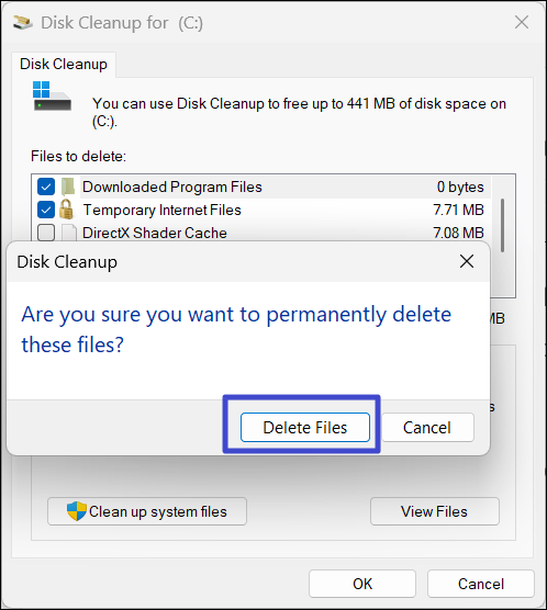 4. Tıklayın “Dosyaları sil”Onaylamak için.