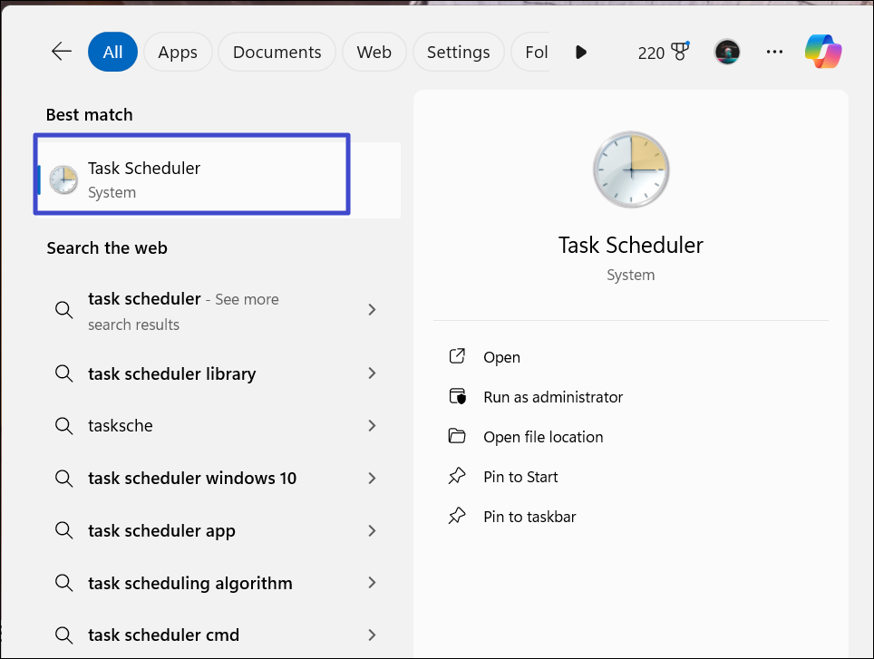 1. Windows + S tuşuna basın, yazınGörev Zamanlayıcısı"Ve"Görev Zamanlayıcısı"Fayda.