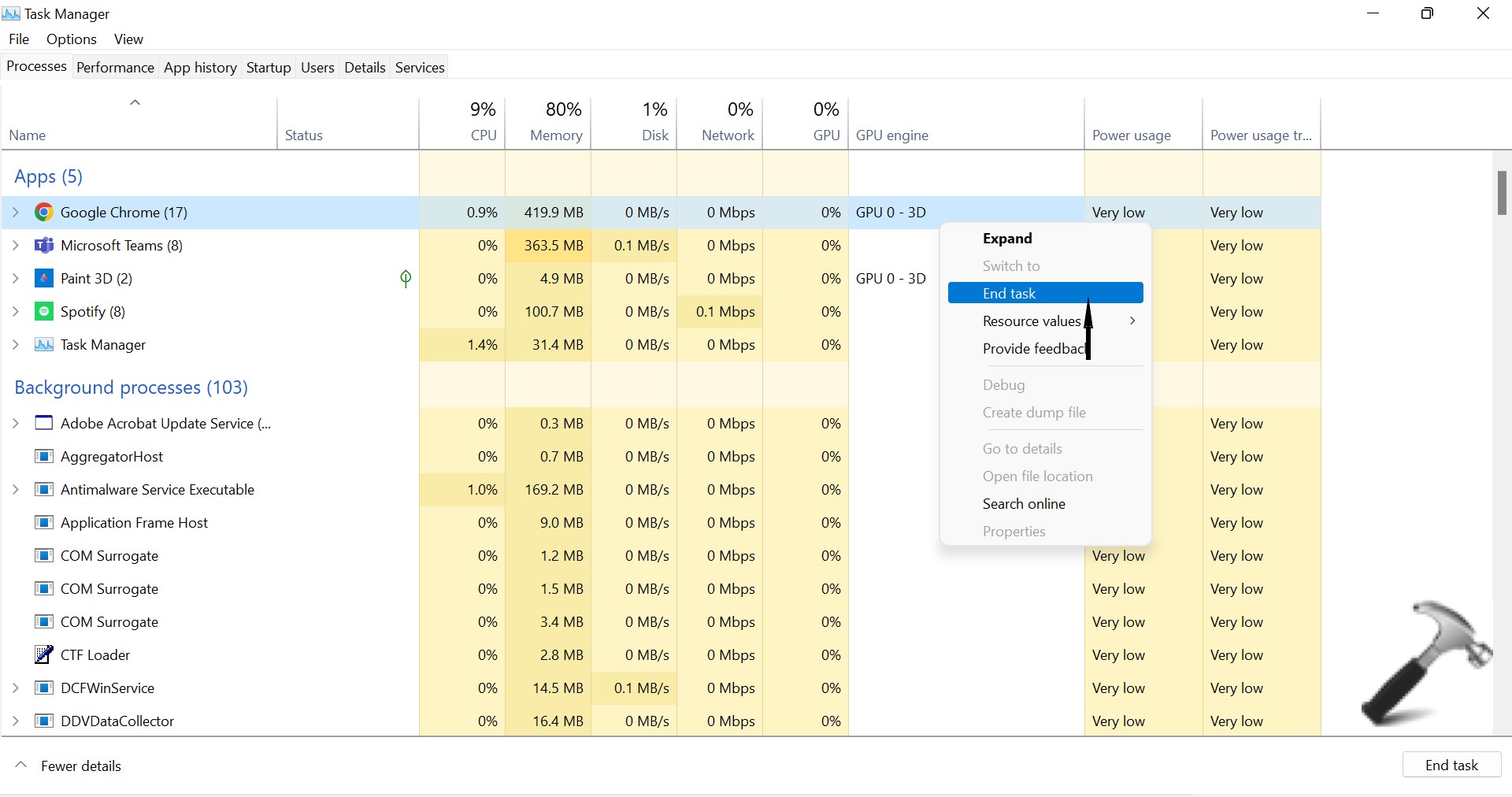 2. Şimdi, çok fazla bellek kullanan gereksiz uygulamaları ve hizmetleri bulun. Ardından, uygulamaya veya hizmete sağ tıklayın ve seçinSon görev. Tüm gereksiz uygulamaları kapatmak için bu seti kopyalayın.
